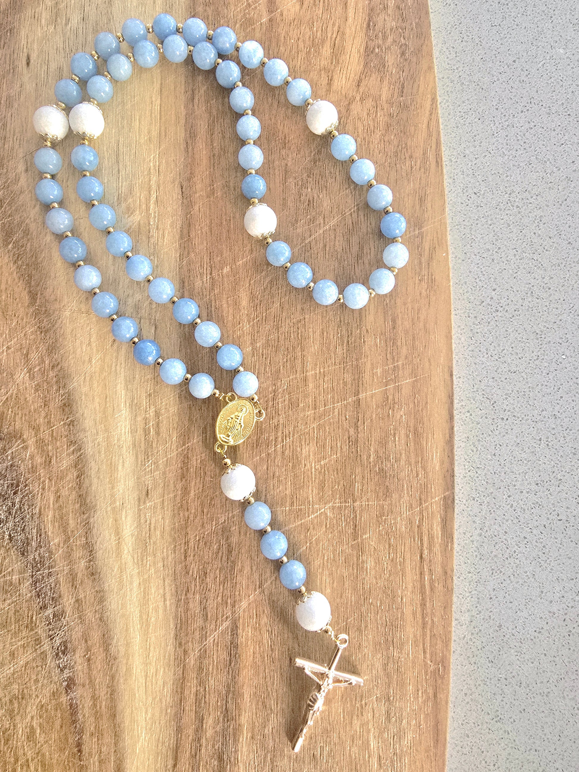 Crafted with blue Hail Mary beads to symbolize her divinity and the white to symbolize her purity and faith.